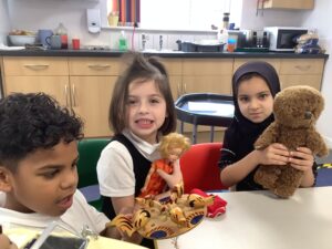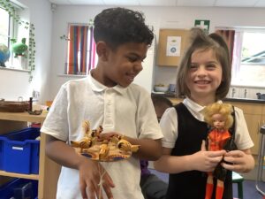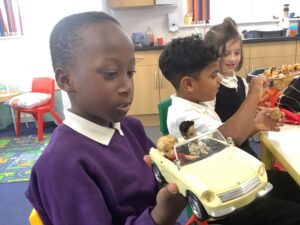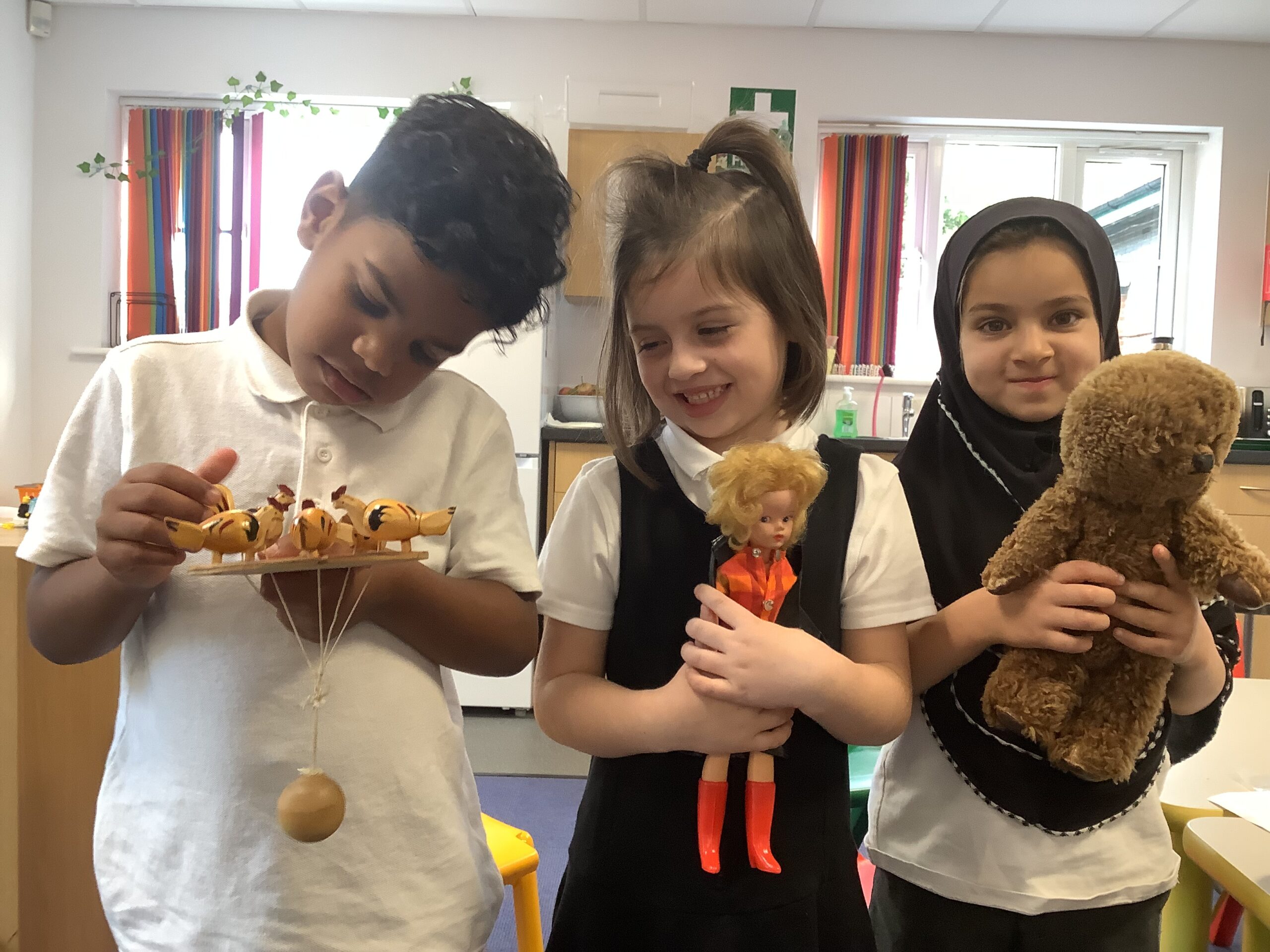 In History we have been continuing our learning about toys, comparing old and new toys. We have been very lucky to borrow a box of very old toys from Saffron Walden library and the children have loved looking at them and explaining how they know that they are old, drawing on their knowledge of materials to help them to understand.